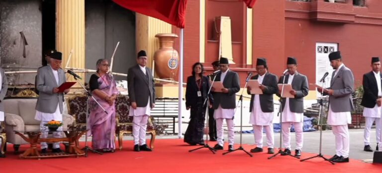 प्रधानमन्त्री सुशीला कार्कीको सिफारिसमा नियुक्त भएका मन्त्रीहरू—जगदीश खरेल, महावीर पुन, अनिल सिन्हा र मदन परियारले आज पद तथा गोपनीयताको शपथ लिइरहेका छन्। समारोह अहिले शीतल निवासमा जारी छ।