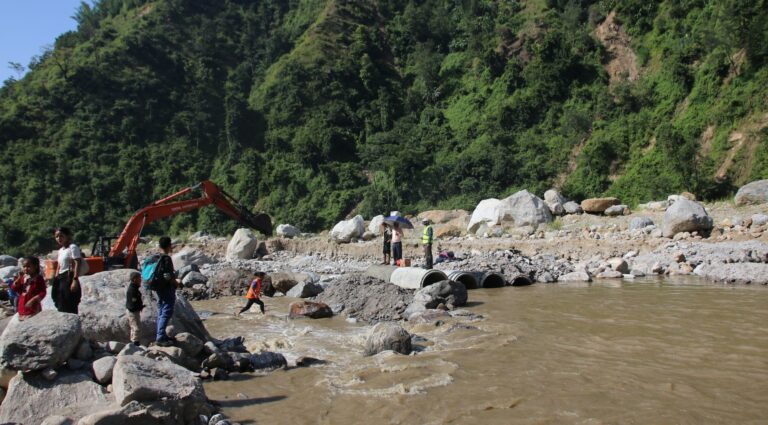 यात्रुले करिब १५ मिनेट पैदलयात्रा गरेर खोला पार गर्दै आएका छन् । गत बिहीबारदेखि डाइभर्सन र पहुँच मार्ग निर्माणको काम भइरहेको छ । गत वर्षको असोज १२ गते आएको बाढीले यहाँ रहेको सडक पुल बगाएको थियो । सडक पुल बगेपछि यहाँ अस्थायी डाइभर्सनबाट यातायात सञ्चालन हुँदै आएकोमा गत जेठमा स्थायी डाइभर्सन निर्माण गरिएको थियो ।