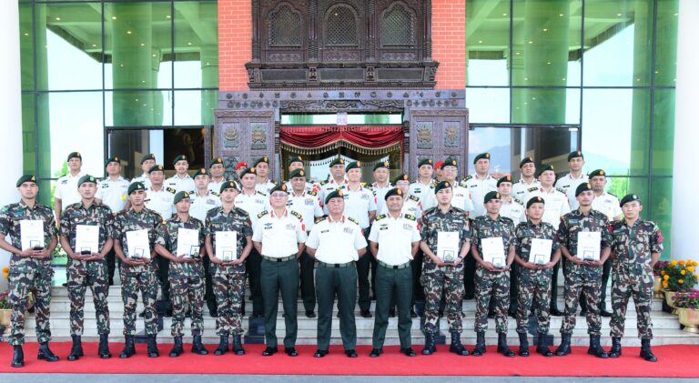 काठमाडौँ,। प्रधानसेनापति अशोक राज सिग्देलले संयुक्त अधिराज्य बेलायतमा सञ्चालन भएको ‘एक्सरसाइज क्याब्रिअन पट्रोल २०२५’ मा स्वर्ण पदक विजेता नेपाली सेनाको टोलीलाई आज प्रशंसा पदक प्रदान गर्नुभएको छ ।