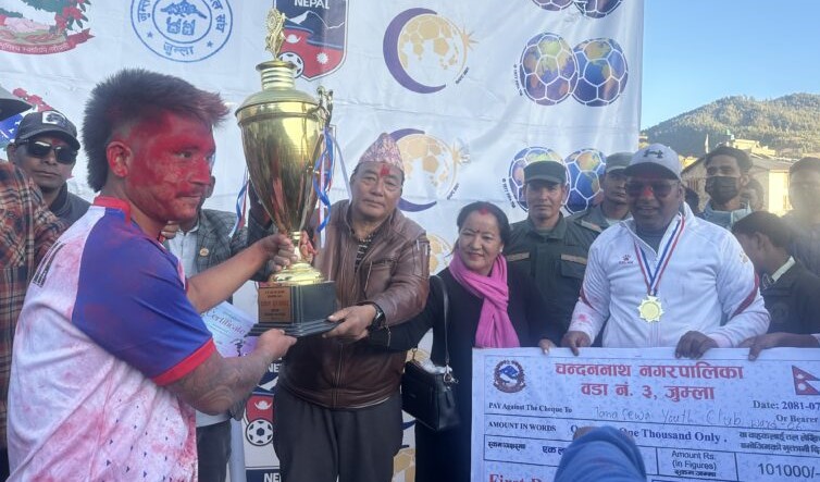 जुम्ला, । चन्दननाथ नगरपालिकाको आयोजनामा सम्पन्न जिल्लास्तरीय फुटबल प्रतियोगितामा विजयी हुने जनसेवा युवा क्लबलाई रु एक लाखसहित उपाधि प्रदान गरिएको छ ।