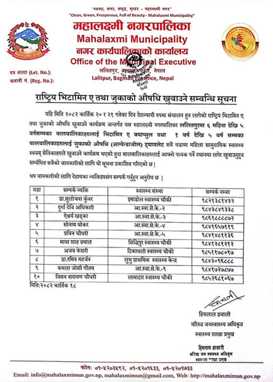 ललितपुर — ललितपुरको महालक्ष्मी नगरपालिकामा कार्तिक २० र २१ गते बालबालिकालाई भिटामिन ‘ए’ तथा जुकाको औषधि खुवाउने भएको छ ।