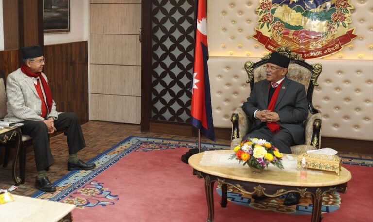 काठमाडौँ, । नेपाली कम्युनिष्ट पार्टीका संयोजक पुष्पकमल दाहाल ‘प्रचण्ड’ र पूर्वप्रधानमन्त्री झलनाथ खनालबीच भेटवार्ता भएको छ ।