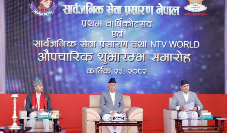 काठमाडौँ, । राष्ट्रपति रामचन्द्र पौडेलले सार्वजनिक सेवा प्रसारण ९पिएसबी० नेपालले स्थापनाको प्रथम वार्षिकोत्वसका अवसरमा ‘एनटिभी वर्ल्ड’को औपचारिक शुभारम्भ गरेका छन् । सिंहदरबारस्थित पिएसबी, नेपाल टेलिभिजनको परिसरमा आज आयोजित समारोहमा नेपाल टेलिभिजनको अङ्ग्रेजी च्यानलका रुपमा ‘एनटिभी वर्ल्ड’ शुभारम्भ गरिएको हो । यो च्यानलले नेपाल अन्तरराष्ट्रिय जगत्मा नेपाल बुझिने सामग्रीहरु समावेश गर्नेछ ।