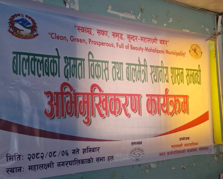 ललितपुर — महालक्ष्मी नगरपालिकाले बालबालिकाको क्षमता विकास, सहभागिता अभिवृद्धि तथा बालमैत्री स्थानीय शासन (CFLG) कार्यान्वयनलाई सुदृढ बनाउन अभिमुखीकरण कार्यक्रम सम्पन्न गरेको छ। शनिबार आयोजित कार्यक्रममा नगर क्षेत्रका सबै वडाबाट आएका बाल क्लब समितिका अध्यक्ष तथा पदाधिकारीहरूको सक्रिय सहभागिता रहेको थियो।
