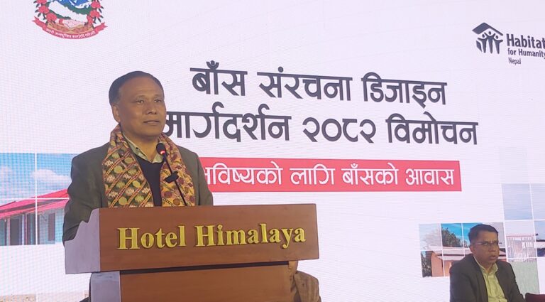 ‘भविष्यका लागि बाँसको आवास’ भन्ने नाराका साथ ‘ह्याविट्याट फर ह्युम्यानिटी’ नेपालले आज यहाँ आयोजना गरेको ‘बाँस संरचना डिजाइन मार्गदर्शन २०८२’ विमोचन कार्यक्रममा उहाँले स्थानीय उत्पादन उपयोगमा प्रोत्साहन गर्न आफूले योजना बनाइरहेको बताए ।