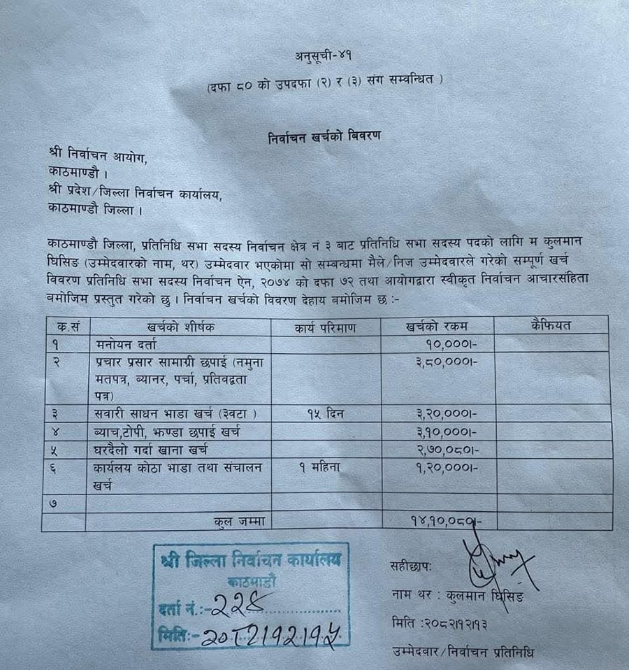 काठमाडौं, । उज्यालो नेपाल पार्टीका अध्यक्ष कुलमान घिसिङले आफ्नो चुनावी खर्च विवरण सार्वजनिक गरेका छन् । फागुन २१ को निर्वाचनमा काठमाडौं ३ बाट प्रतिनिधसभा सदस्य पदको उम्मेदवार रहेका घिसिङले निर्वाचन आयोगमा आफ्नो खर्च विवरण पेस गरेका हुन् ।