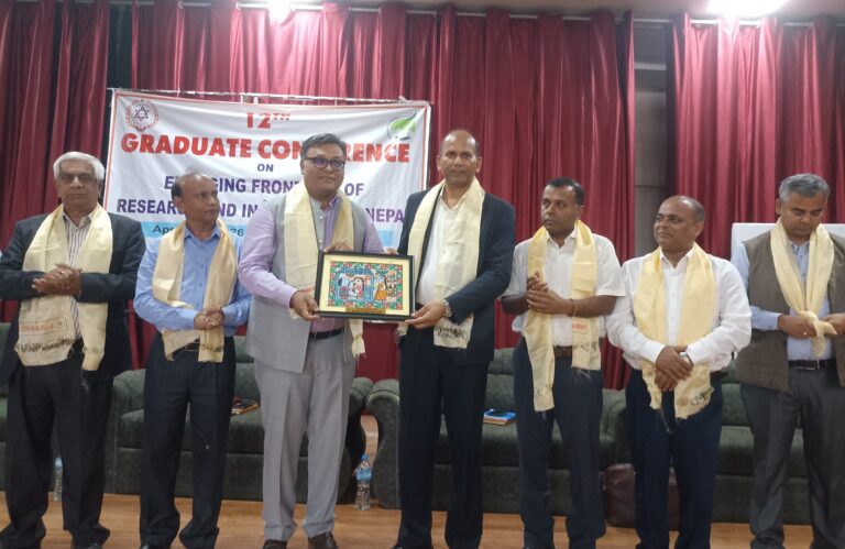 महेन्द्रनगर (धनुषा), । अनुसन्धान र नवप्रवर्तनसम्बन्धी विषयमा केन्द्रित १२औँ स्नातकोत्तर सम्मेलन आज देखि जनकपुरधाममा सुरु भएको छ । राजर्षि जनक विश्वविद्यालय, अनुसन्धान केन्द्र जनकपुरधामको आयोजनामा भएको सो सम्मेलनको उद्घाटन गर्दै मधेस स्वास्थ्य विज्ञान प्रतिष्ठानका उपकुलपति डा।अन्कुर साहले मुलुकको समग्र विकासका लागि अनुसन्धानलाई प्राथमिकता राख्नुपर्ने बताए ।