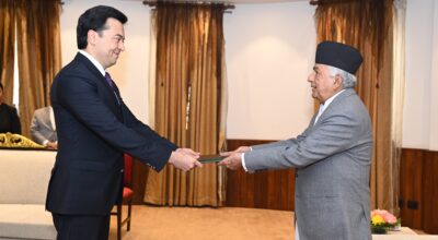 काठमाडौँ, । राष्ट्रपति रामचन्द्र पौडेलसमक्ष नेपालका लागि नवनियुक्त राजदूतहरूले आआफ्नो ओहोदाको प्रमाणपत्र पेस गरेका छन्