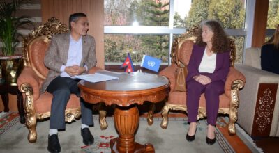 काठमाडौँ, । गृहमन्त्री ओमप्रकाश अर्यालसँग संयुक्त राष्ट्रसङ्घ, नेपालका आवासीय संयोजक लिला पिटर्स याहियाले शिष्टाचार भेट
