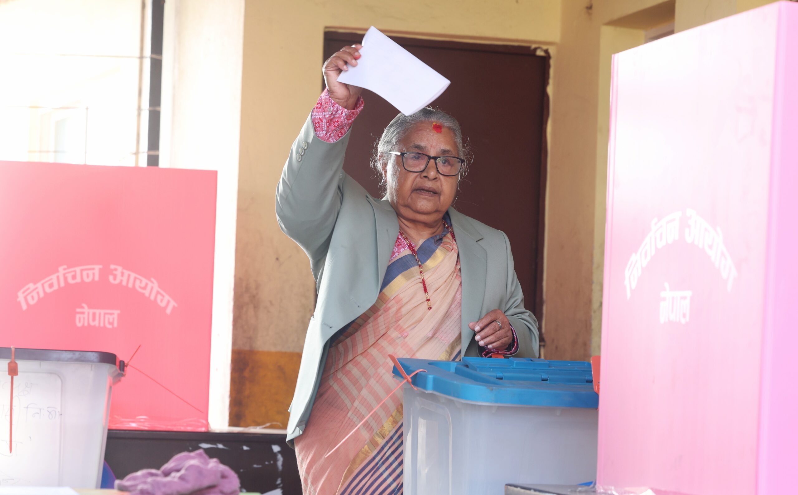 काठमाडौँ, । प्रधानमन्त्री सुशीला कार्कीले काठमाडौँ क्षेत्र नं ५ स्थित धापासी निमावली फैमालचुली मतदान केन्द्रबाट मतदान गरेका छन् । मतदानपश्चात् सञ्चारकर्मीलाई प्रतिक्रिया दिँदै निर्वाचन उत्साहपूर्वक भइरहेकामा आफू खुसी भएको बताए। तपाईंको नेतृत्वमा निर्वाचन हुँदैछ भन्ने प्रश्नको जवाफमा उनले भने, “मैले मेरो आफ्नो कर्तव्य पूरा गरेँ, देशमा निर्वाचन हुँदैछ, म अत्यन्त खुसी छु ।”